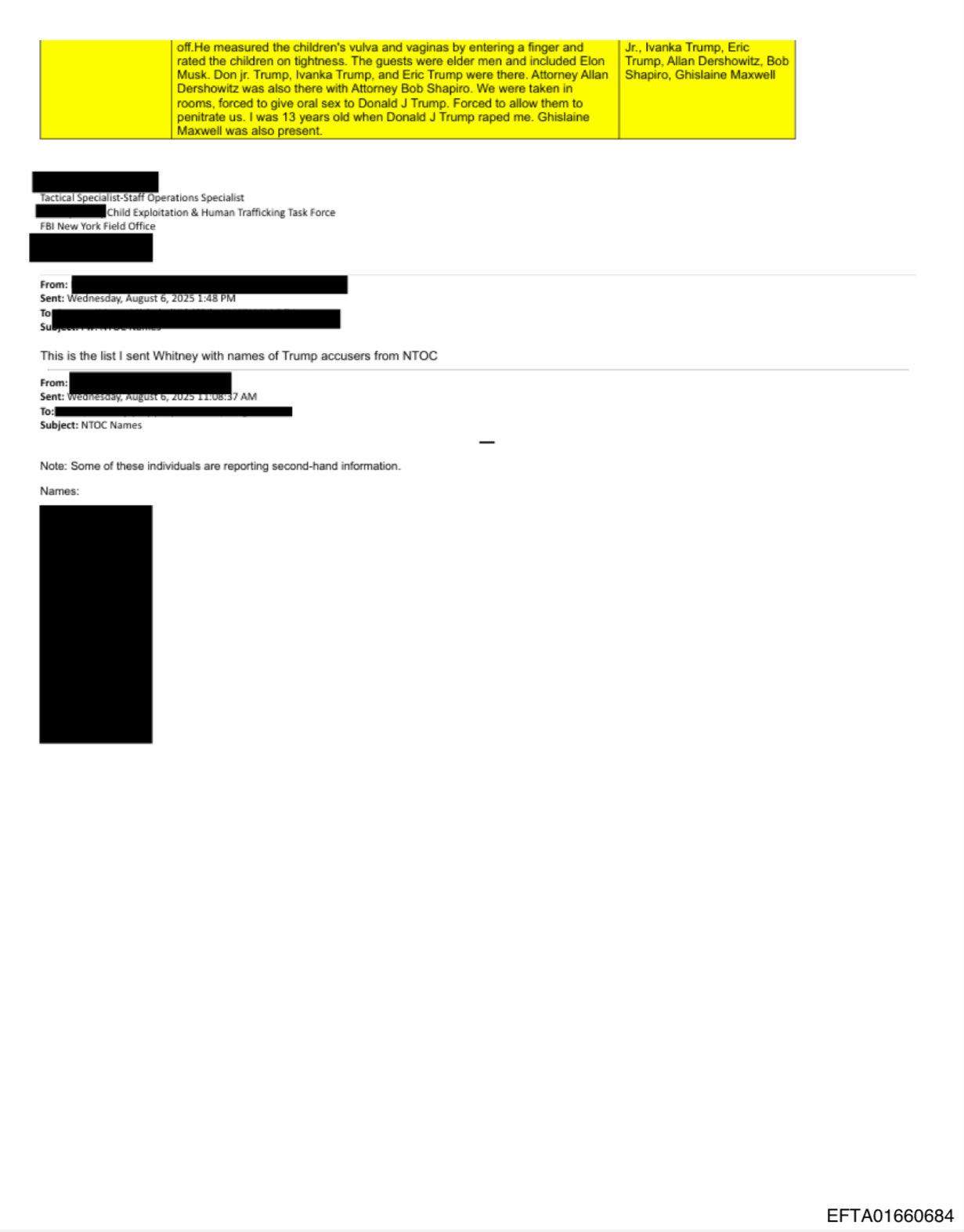One document recounts an anonymous victim’s testimony alleging Ghislaine Maxwell introduced her to Trump at a New York party in a manner suggesting availability, but the victim clarified that “nothing happened.” Another references a 2016 complaint accusing Trump of raping a 13-year-old, which formed the basis for lawsuits that were later dropped without verification.