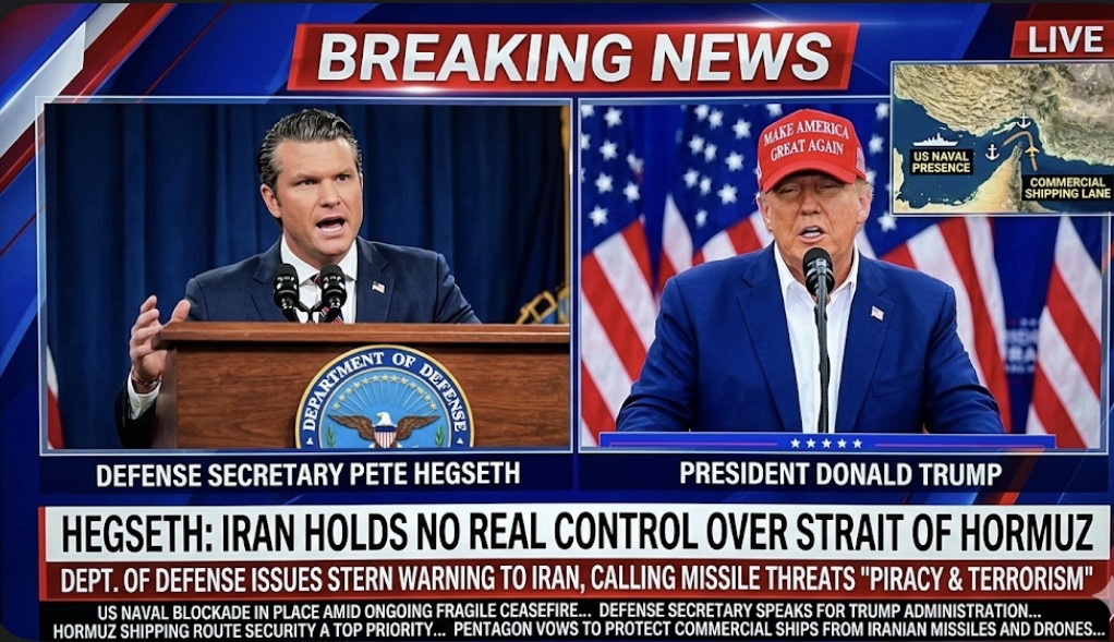 Defense Secretary Pete Hegseth, Speaking for President Donald Trump’s Administration, Tells Iran It Holds No Real Control Over the Strait of Hormuz: “Threatening Missiles and Drones at Lawful Commercial Ships Is Piracy and Terrorism,” Amid Ongoing Fragile Ceasefire and US Naval Blockade