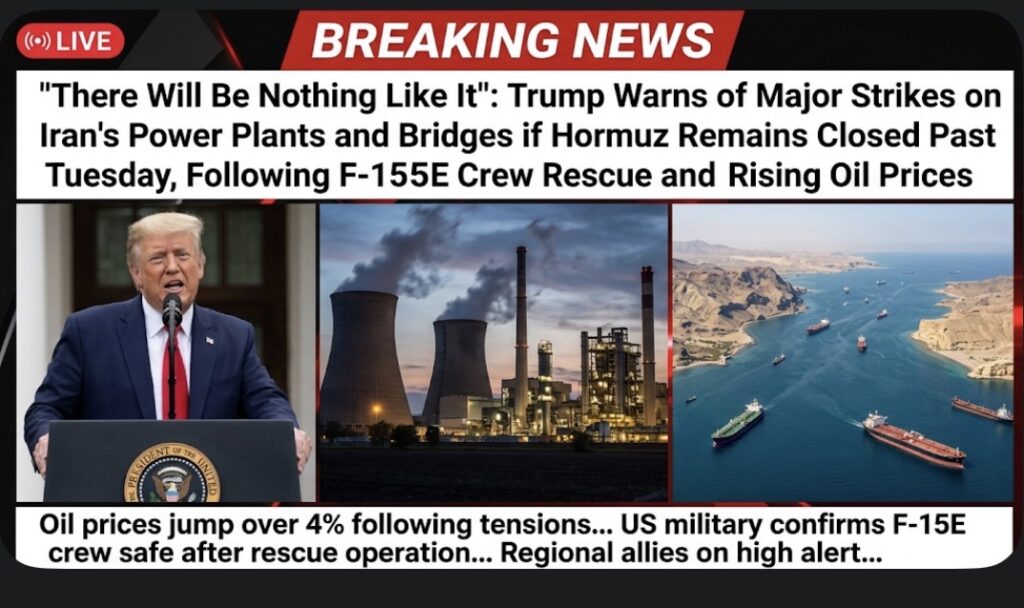 “There Will Be Nothing Like It”: Trump Warns of Major Strikes on Iran’s Power Plants and Bridges if Hormuz Remains Closed Past Tuesday, Following F-15E Crew Rescue and Rising Oil Prices