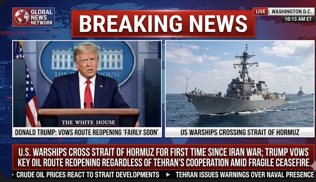 U.S. Warships Cross Strait of Hormuz for First Time Since Iran War as Trump Vows the Key Oil Route Will Reopen ‘Fairly Soon’ Regardless of Tehran’s Cooperation Amid Fragile Ceasefire