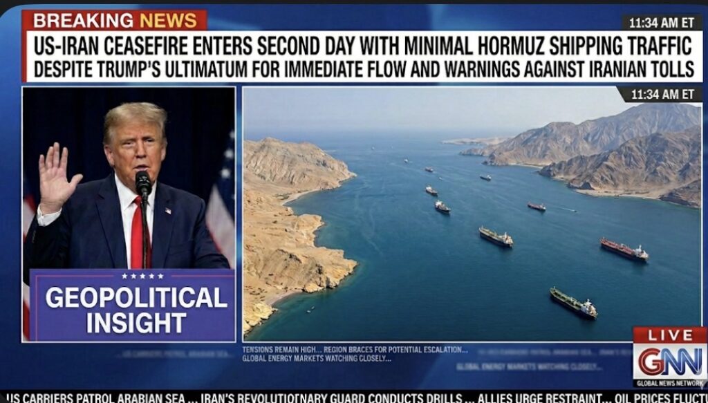 US-Iran Ceasefire Enters Second Day With Minimal Hormuz Shipping Traffic Despite Trump’s Ultimatum for Immediate Flow and Warnings Against Iranian Tolls